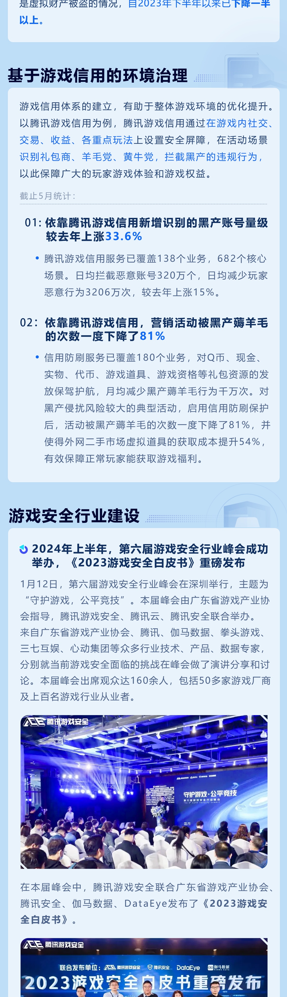 游戏黑产通过恶意抢占奖励,严重干扰游戏的正常运营。2024年上半年,腾讯游戏安全信用防刷服务月均减少黑产薅羊毛行为千万次。对黑产侵扰风险较大的典型活动,启用信用防刷保护后,活动被黑产薅羊毛的次数一度下降了81%,并使得外网二手市场虚拟道具的获取成本提升54%,有效保障正常玩家能获取游戏福利。