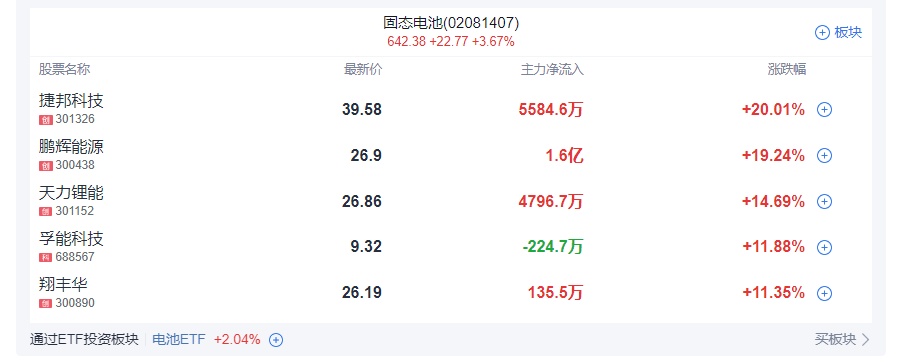 新能源赛道股爆发,固态电池、风电、光伏等方向领涨,天力锂能、鹏辉能源、圣阳股份、传艺科技、丰元股份等多股涨停或涨超10%。