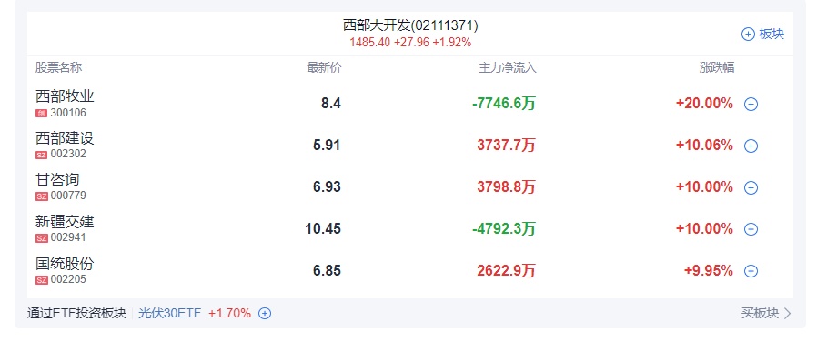 西部大开发概念股继续活跃,新疆交建、西部建设均2连板,西部牧业、北新路桥、天山股份、成都路桥等纷纷冲高。