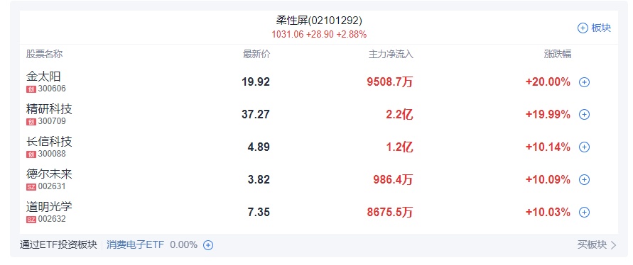 折叠屏概念再度活跃,金太阳、凯盛科技、创维数字等多股涨停,中亚股份、瑞华泰、宜安科技、万顺新材等跟涨。