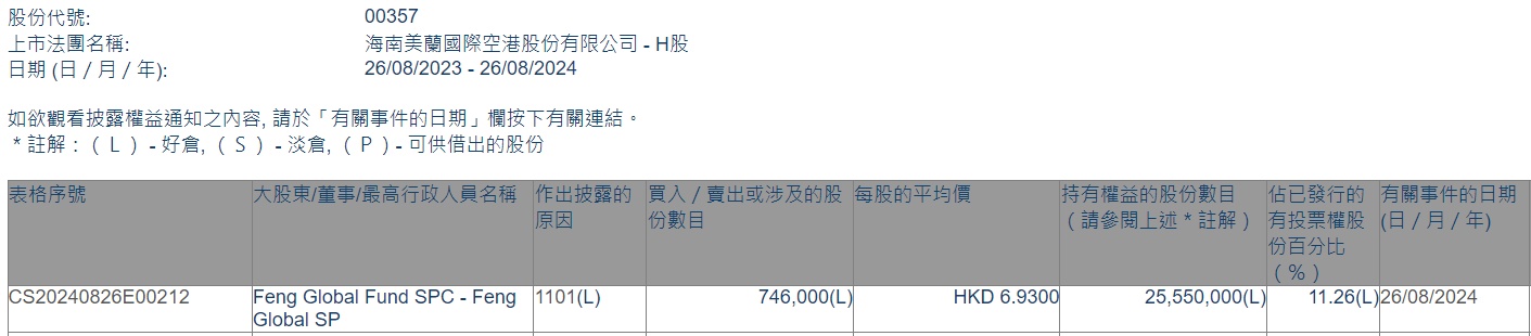 智通财经APP获悉,据香港联交所最新数据显示,8月26日,Feng Global Fund SPC - Feng Global SP增持美兰空港(00357)74.6万股,每股作价6.93港元,总金额约516.98万港元。增持后最新持股数目为2555万股,持股比例为11.26%。