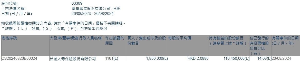 智通财经APP获悉,香港联交所最新资料显示,8月23日,长城人寿增持秦港股份(03369)185万股,每股作价2.088港元,总金额为386.28万港元。增持后最新持股数目约为1.16亿股,持股比例为14.03%。
