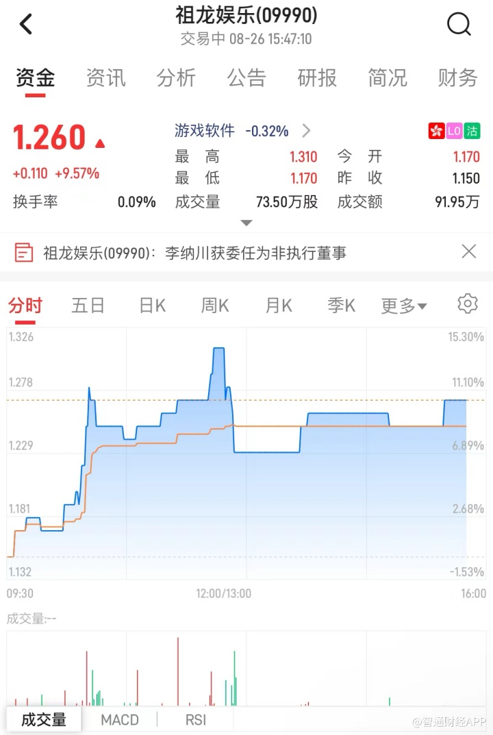 受业绩利好影响,祖龙娱乐股价于8月26日大幅上涨,盘中一度冲高至1.31港元,最大涨幅达到13.91%。中金公司在研报中维持祖龙娱乐跑赢行业评级,维持目标价1.60港元,对应10倍2025年Non-IFRS市盈率,较8月26日收盘价有24%的潜在上行空间。