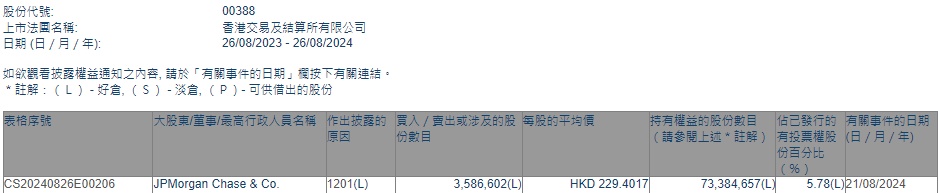 智通财经APP获悉,香港联交所最新资料显示,8月21日,摩根大通减持香港交易所(00388)358.6602万股,每股作价229.4017港元,总金额约为8.23亿港元。减持后最新持股数目为7338.4657万股,最新持股比例为5.78%。