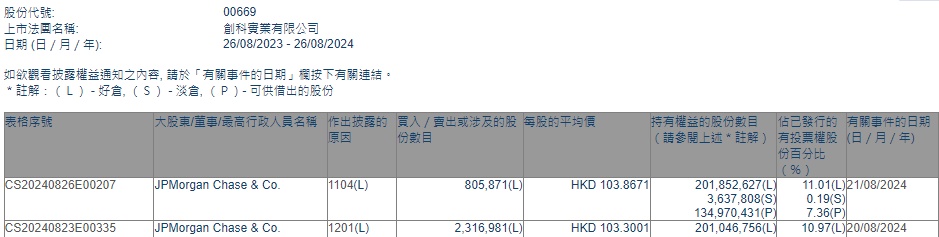 智通财经APP获悉,香港联交所最新资料显示,8月20日,摩根大通减持科创实业(00669)231.6981万股,每股作价103.3001港元,总金额约为2.39亿港元。减持后最新持股数目约为2.01亿股,最新持股比例为10.97%。
