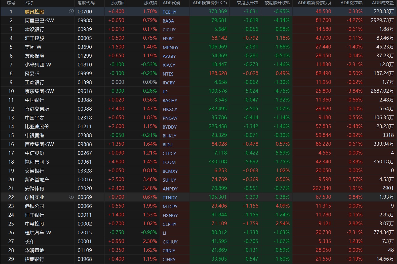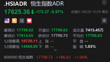 智通财经APP获悉,周一美股三大指数涨跌不一,恒生指数ADR下跌,按比例计算,收报17625.36点,较香港收市下跌173.37点或0.97%。
