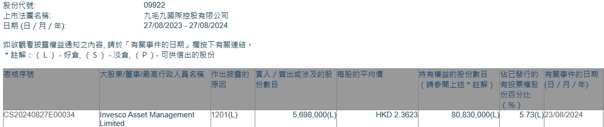智通财经APP获悉,香港联交所最新资料显示,8月23日,景顺资产管理减持九毛九(09922)569.8万股,平均每股作价2.3623港元,总金额约为1346.04万港元。减持后最新持股数目为8083万股,最新持股比例为5.73%。