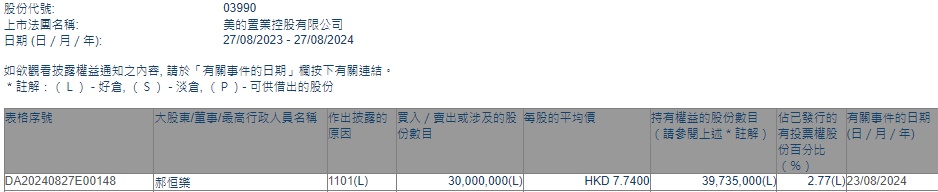 智通财经APP获悉,香港联交所最新资料显示,8月23日,总裁郝恒乐增持美的置业(03990)3000万股,平均每股作价7.74港元,总金额约为2.32亿港元。增持后最新持股数目为3973.5万股,持股比例为2.77%。