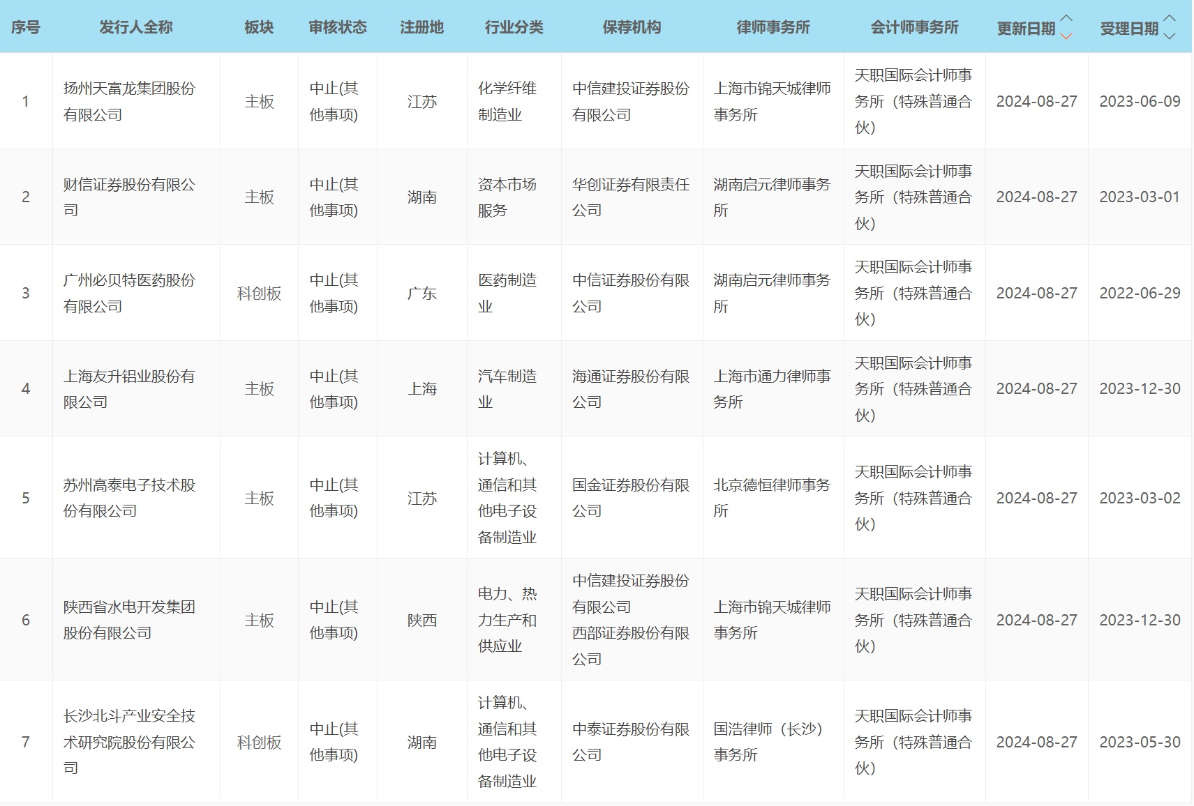 智通财经APP获悉,8月27日,天富龙、财信证券、必贝特、友升股份、高泰电子、陕西水电、北斗院共7家企业申请上交所IPO审核状态变更为“中止”。