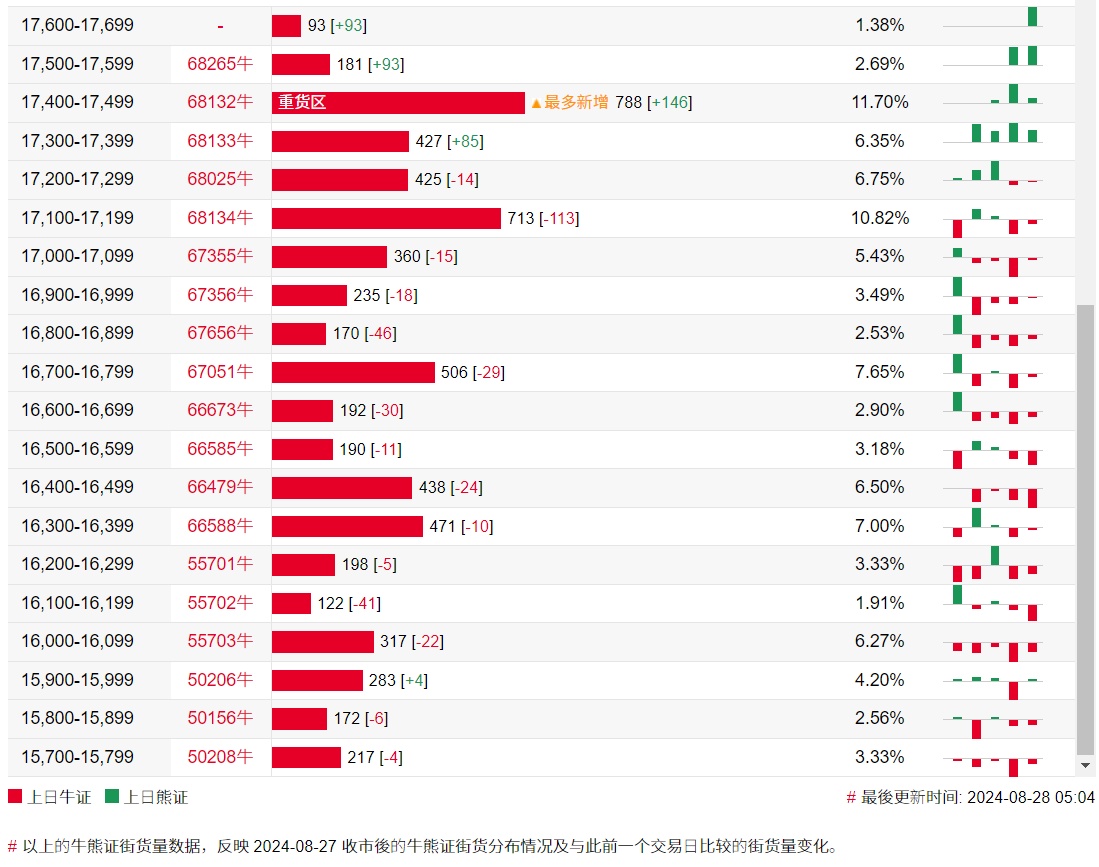 牛证街货重货区在17400-17499区间,该区间最新牛证数量为788张,较上一交易日增加146张;最多新增在相同区间。