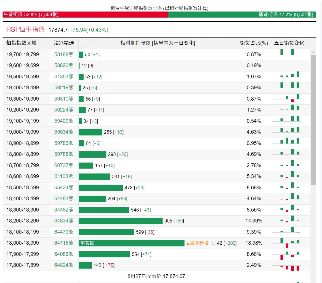 法兴恒指牛熊证街货分布图中的数据显示,熊证街货重货区在18000-18099区间,该区间最新熊证数量为1142张,较上一交易日增加202张;最多新增在相同区间。