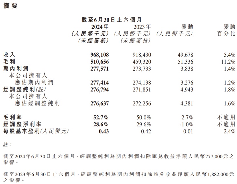 具体而言,2024年上半年公司营收约9.68亿元(单位为人民币,下同),同比增长5.4%;毛利约5.11亿元,同比增长11.2%;公司拥有人应占利润约2.77亿元,同比增长1.2%。