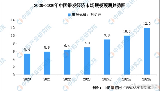老年人口的增加推动银发经济市场规模快速发展。中商产业研究院发布的《2022-2027年中国银发经济发展趋势及投资风险研究报告》显示,2023年我国银发经济规模大概在7万亿元左右,占GDP比重大约为6%;预计2024年中国银发经济市场规模将达9万亿元,2026年将达12万亿元。