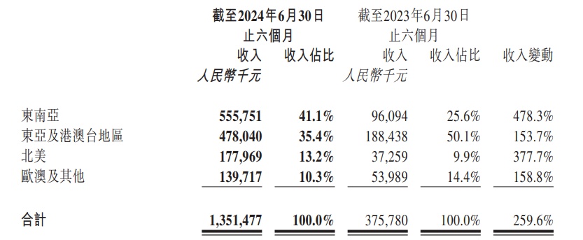 细化来看,2024年上半年,泡泡玛特来自东南亚、东亚及港澳台地区、北美、欧澳及其他市场的收入增速均实现翻倍增长。其中,东南亚是泡泡玛特最大、增速最快的海外市场,上半年营收同比增长 478% 至 5.6 亿元,东亚及中国港澳台地区营收同比增长153.7%至4.8亿元,北美市场营收同比增长377.7%至1.8亿元,欧澳及其他市场实现营收同比增长158.8%至1.4亿元。