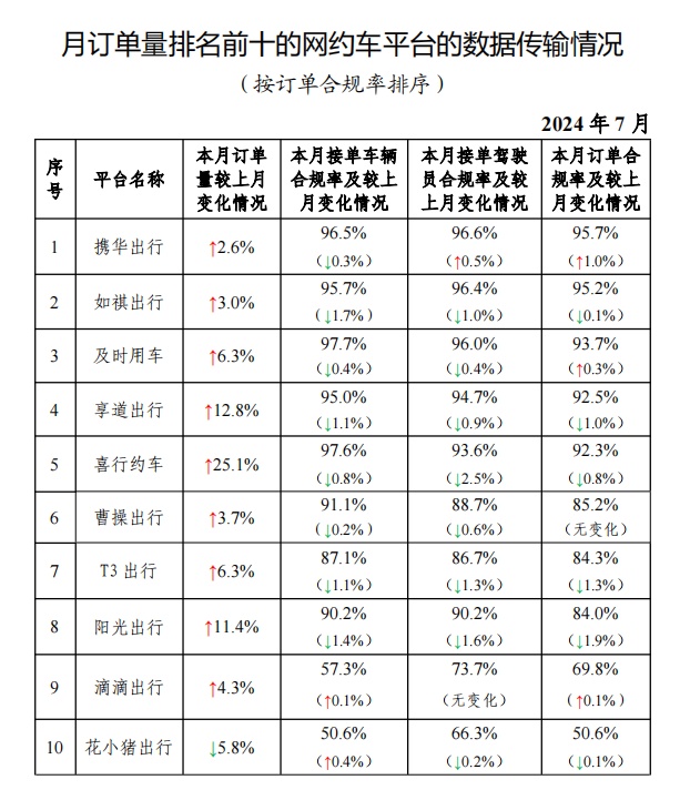 一、在订单量前10名的平台中,按订单合规率(指驾驶员和车辆均获得许可的订单量占比)从高到低的分别是携华出行、如祺出行、及时用车、享道出行、喜行约车、曹操出行、T3出行、阳光出行、滴滴出行、花小猪出行。本月订单合规率增长前3名的依次是携华出行、及时用车、滴滴出行;增长最后3名的依次是享道出行(-1.0%)、T3出行(-1.3%)、阳光出行(-1.9%)。