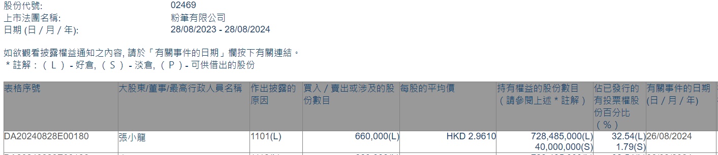 智通财经APP获悉,香港联交所最新资料显示,8月26日,董事会主席张小龙增持粉笔(02469)66万股,每股作价2.9610港元,总金额约为195.43万港元。增持后最新持股数目约为7.28亿股,最新持股比例为32.54%。