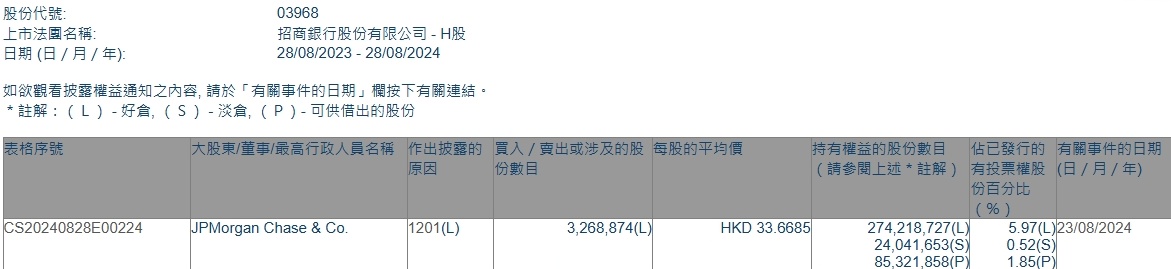 智通财经APP获悉,据香港联交所最新数据显示,8月23日,摩根大通减持招商银行(03968)326.8874万股,每股作价33.6685港元,总金额约为1.1亿港元。减持后最新持股数目约为2.74亿股,持股比例为5.97%。