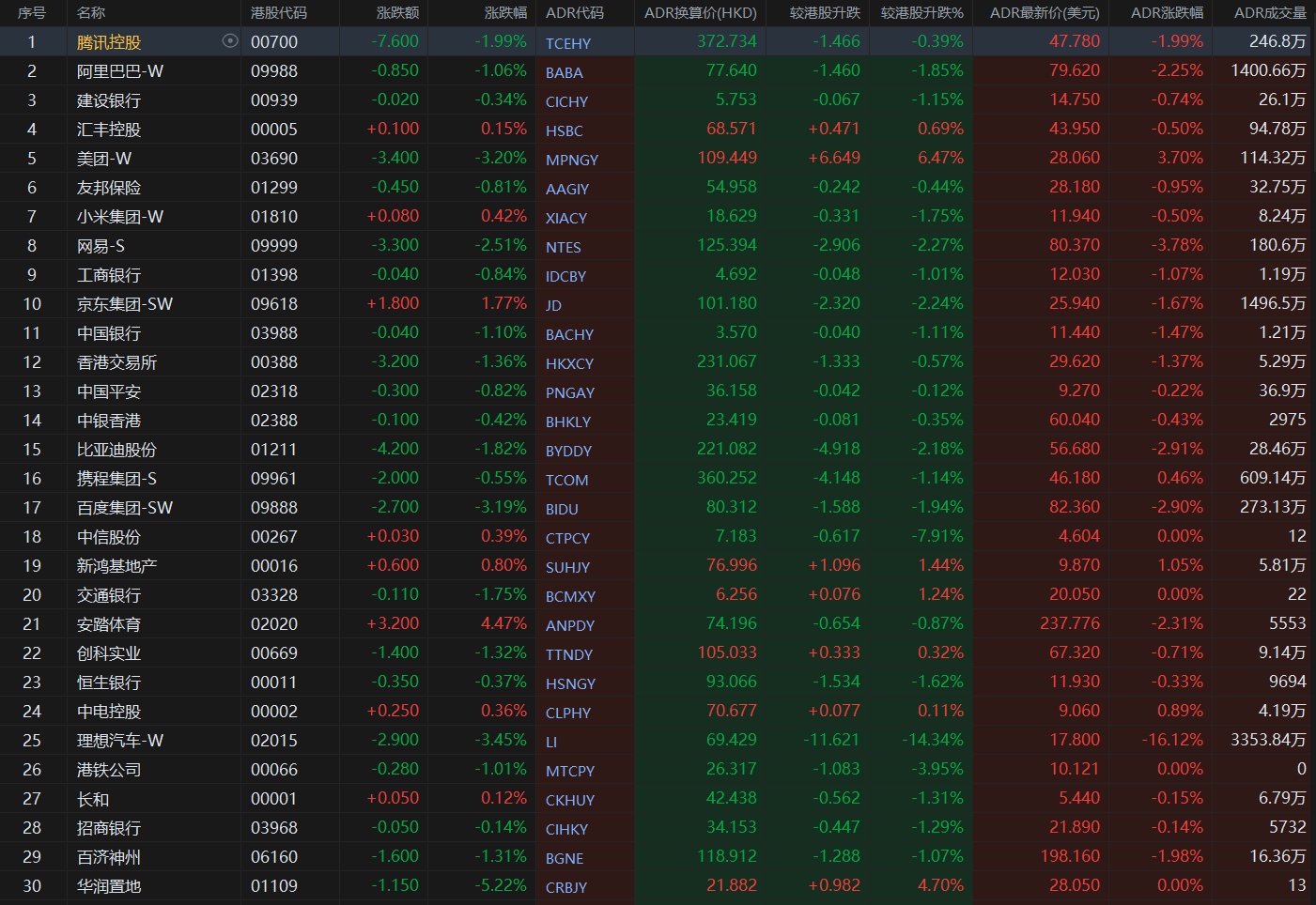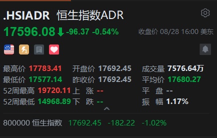 智通财经APP获悉,周三美股三大指数集体下跌,恒生指数ADR下跌,按比例计算,收报17596.08点,较香港收市下跌96.37点或0.54%。