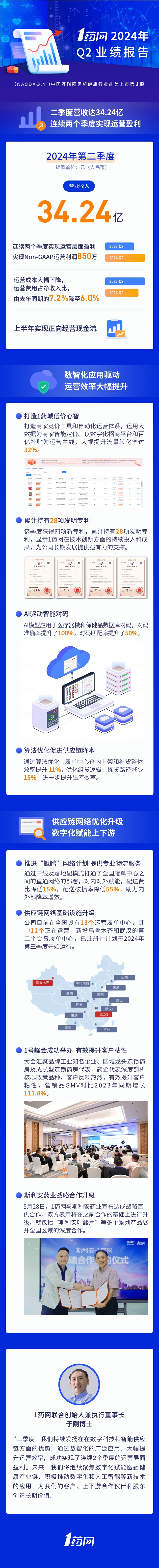 智通财经APP获悉,1药网(YI.US)发布2024年第二季度业绩报告。报告显示,1药网该季度实现营收34.24亿元人民币;Non-GAAP运营利润为850万元,GAAP运营利润达330万元,已连续两个季度实现运营盈利,并连续实现正向经营性现金流。
