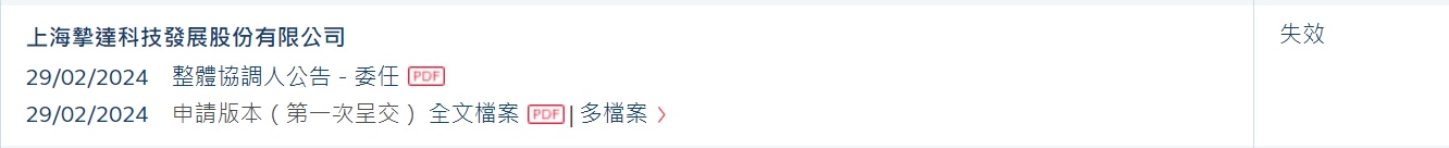 智通财经APP获悉,上海挚达科技发展股份有限公司(简称:挚达科技)于2024年2月29日递交的港股招股书满6个月,于8月29日失效,递表时申万宏源香港为其独家保荐人。