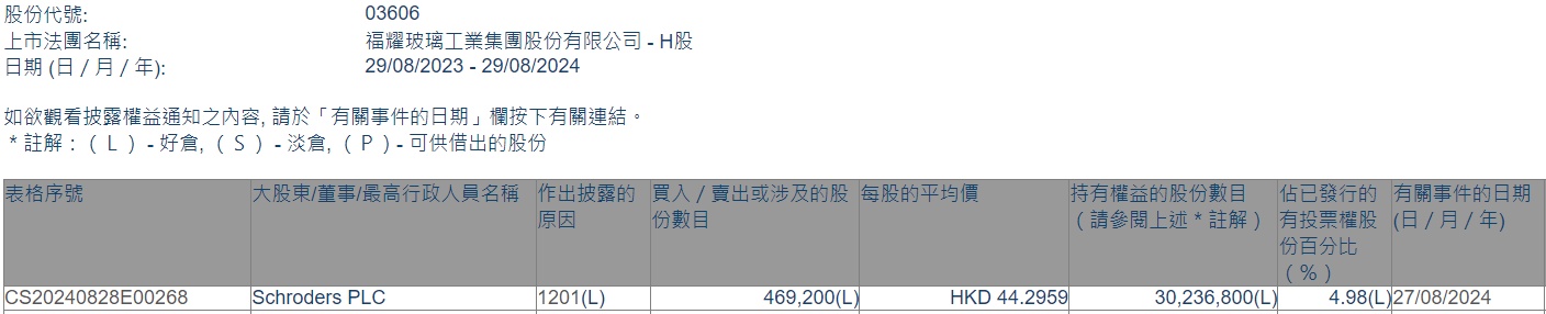 智通财经APP获悉,香港联交所最新资料显示,8月27日,Schroders PLC减持福耀玻璃(03606)46.92万股,每股作价44.2959港元,总金额约为2078.36万港元。减持后最新持股数目为3023.68万股,最新持股比例为4.98%。