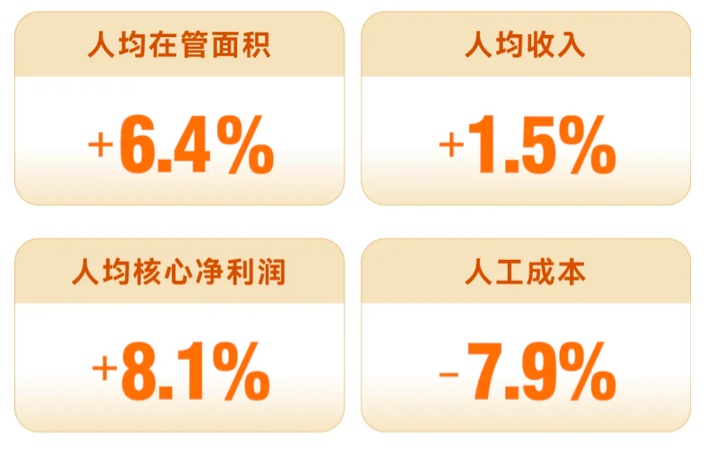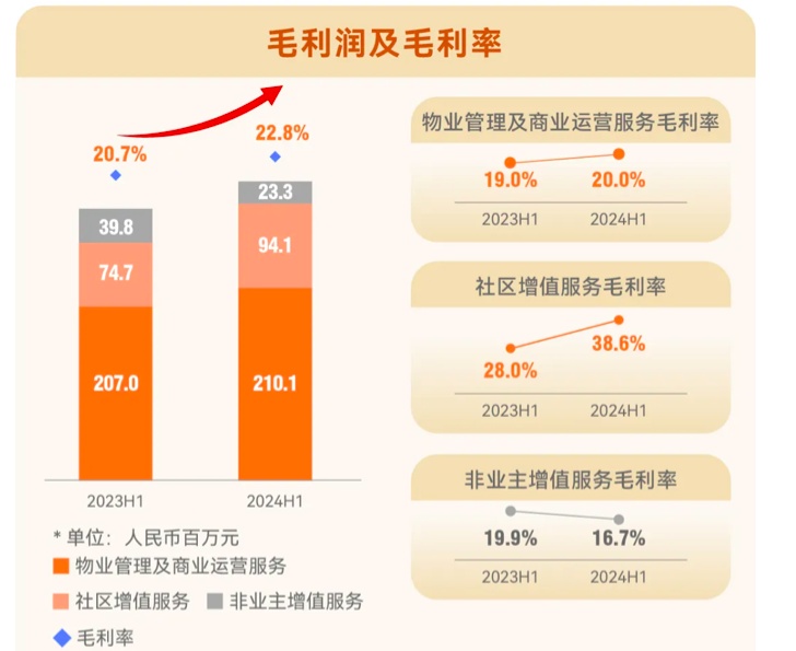 收入结构方面,物业管理及商业运营服务实现收入10.53亿元,占总收入比例73%,稳健压舱。具有周期行业务特征的非业主增值服务收入规模为1.40亿元,收入占比下降至10%。社区增值服务实现收入2.44亿元,占比总收入的17%。与此同时,该业务的毛利率从去年同期的28%提升至38.6%,提质效果明显。