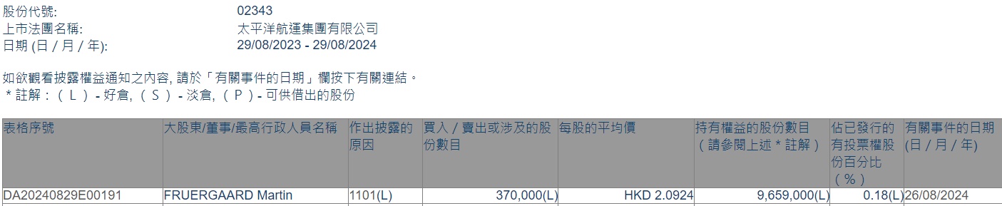 智通财经APP获悉,香港联交所最新资料显示,8月26日,FRUERGAARD Martin增持太平洋航运(02343)37万股,每股作价2.0924港元,总金额约为77.42万港元。增持后最新持股数目为965.9万股,持股比例为0.18%。