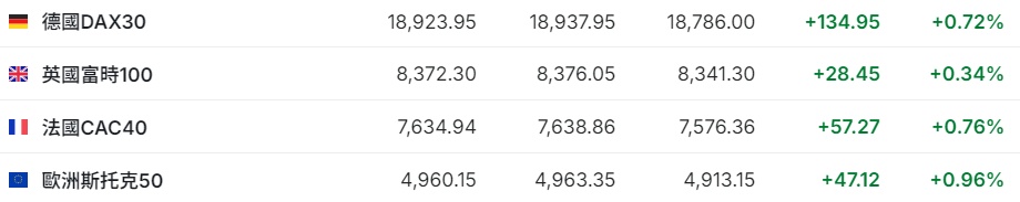 2. 截至发稿,德国DAX指数涨0.72%,欧洲斯托克50指数涨0.34%,英国富时100指数涨0.76%,法国CAC40指数涨0.96%。