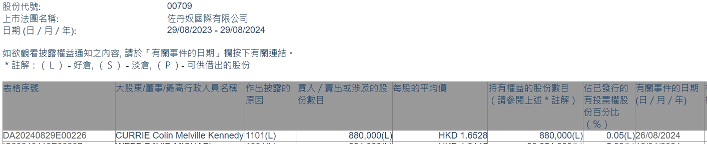 智通财经APP获悉,香港联交所最新资料显示,8月26日,CURRIE Colin Melville Kennedy增持佐丹奴国际(00709)88万股,每股作价1.6528港元,总金额约为145.45万港元。增持后最新持股数目为88万股,持股比例为0.05%。