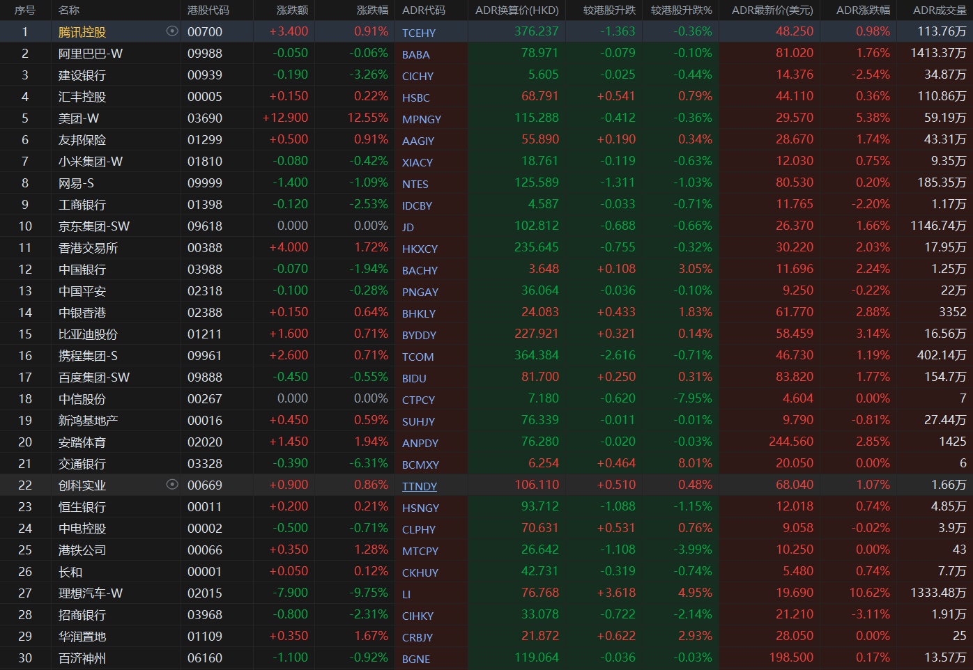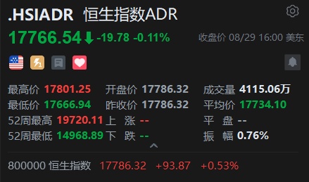 智通财经APP获悉,周四美股三大指数涨跌不一,恒生指数ADR下跌,按比例计算,收报17766.54点,较香港收市下跌19.78点或0.11%。