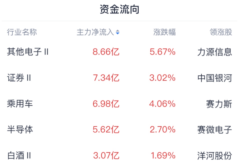 主力资金方面,主力青睐其他电子、证券、乘用车等行业;资金出逃国有大型银行、光伏电力等行业。