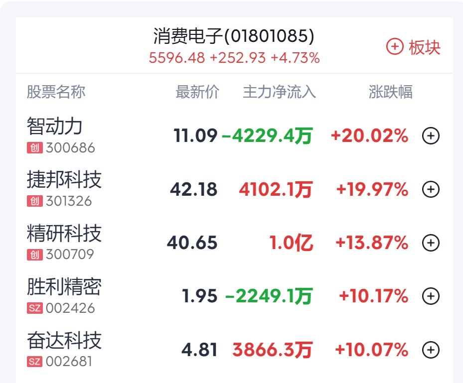 消费电子概念掀涨停潮,智动力、银邦股份、胜利精密等10余股涨停,则成电子、凯盛科技、圣邦股份、优博讯、智微智能等跟涨。