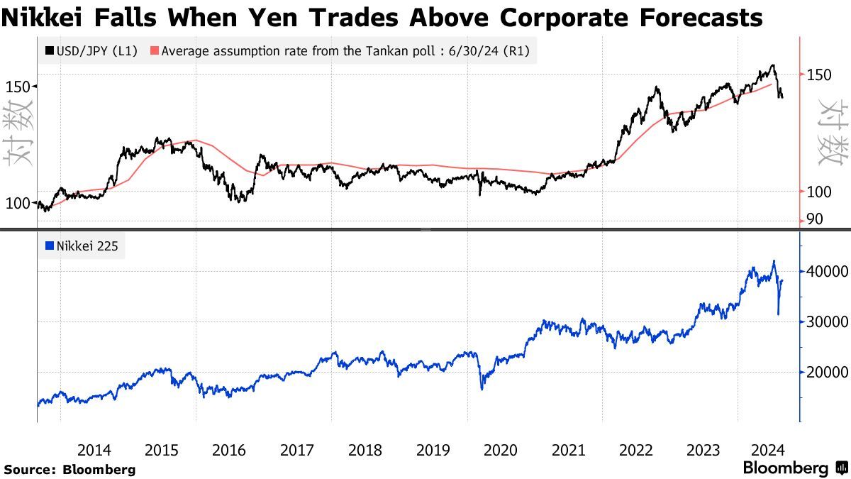 分析人士估计,日元兑美元汇率每升至1日元,日本企业的利润就会下降0.4%-0.6%。三菱UFJ摩根士丹利证券高级投资策略师Kohei Onishi表示:“一旦美元兑日元汇率跌破140的低点,一些公司可能会下调财务预测。”他补充称,历史表明,当日元高于企业预估时,日经225指数往往会下跌。