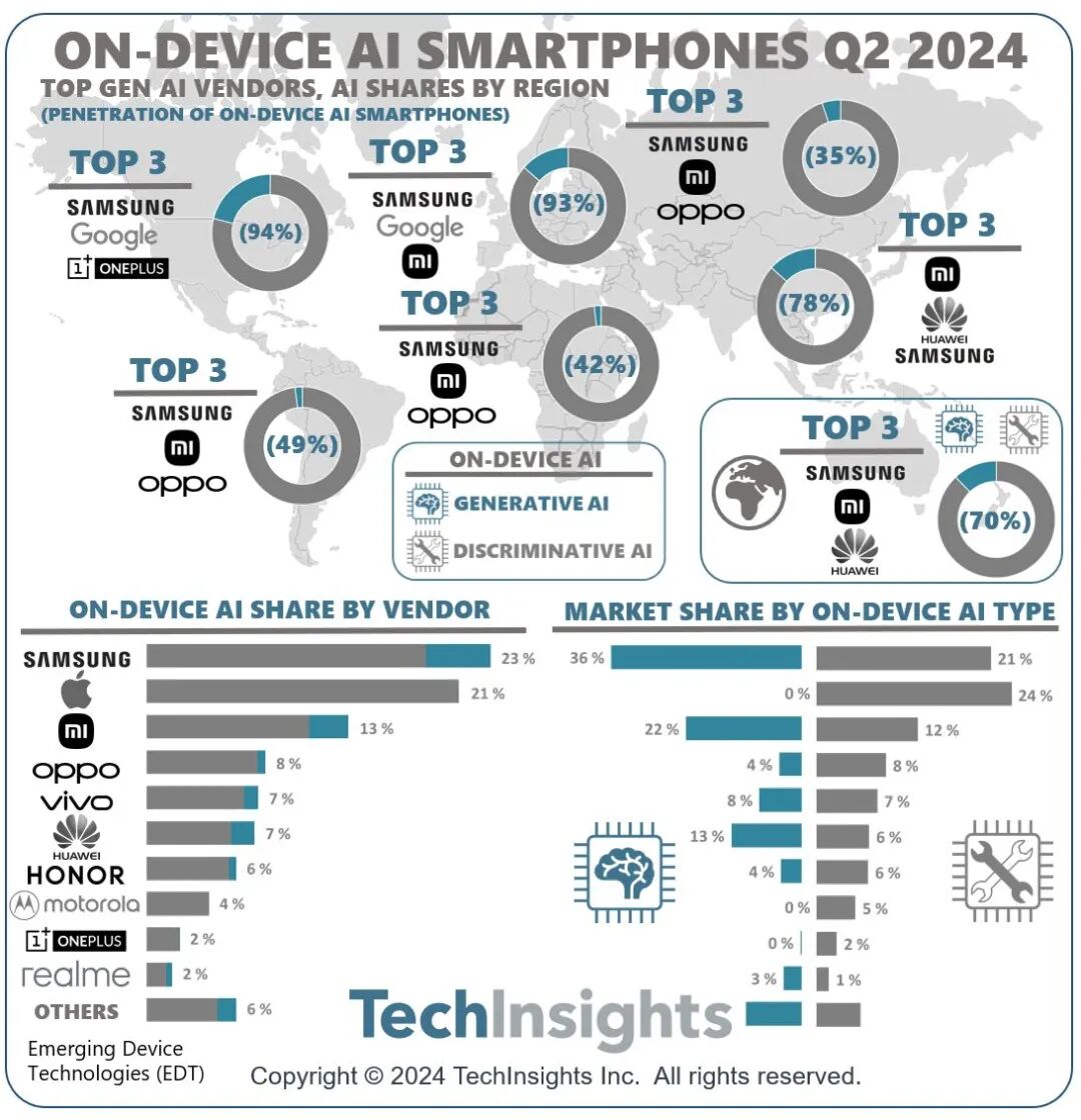 TechInsights指出,三星是最早在Galaxy S24系列中采用生成式AI技术的厂商之一。谷歌、vivo、OPPO和小米都已将生成式AI功能集成到其旗舰智能手机中。高通(QCOM.US)、三星半导体、联发科、海思和谷歌(GOOGL.US)等厂商的高端芯片配备了先进的AI处理子处理器,能够处理复杂的生成式AI任务。