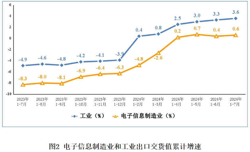 1-7月份,规模以上电子信息制造业累计实现出口交货值同比增长0.6%,较1-6月份提高0.2个百分点。7月份,规模以上电子信息制造业实现出口交货值同比增长2.5%。