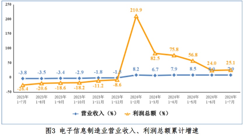 1-7月份,规模以上电子信息制造业实现营业收入8.62万亿元,同比增长7.9%,较1-6月份回落0.1个百分点;营业成本7.52万亿元,同比增长7.6%;实现利润总额3362亿元,同比增长25.1%;营业收入利润率为3.9%,较1-6月份回落0.1个百分点。7月份,规模以上电子信息制造业营业收入1.26万亿元,同比增长7.7%。