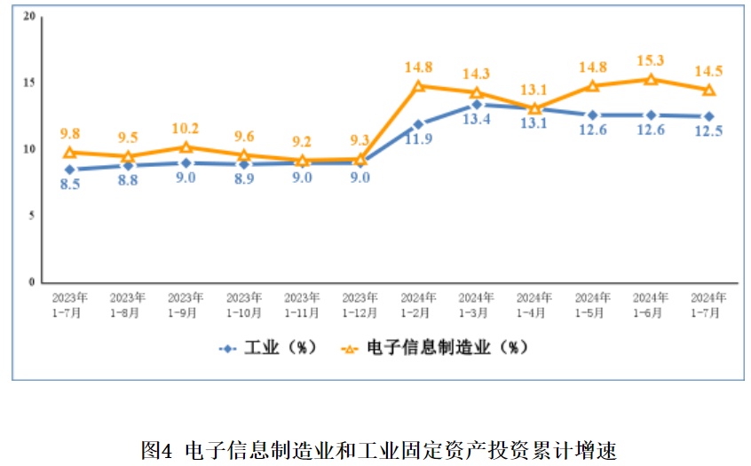 1-7月份,电子信息制造业固定资产投资同比增长14.5%,较1-6月份下降0.8个百分点,比同期工业、高技术制造业投资增速分别高2个和4.8个百分点。