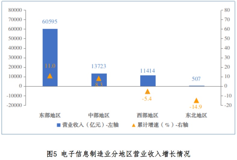 1-7月份,规模以上电子信息制造业东部地区实现营业收入60595亿元,同比增长11%,较1-6月份提高0.005个百分点;中部地区实现营业收入13723亿元,同比增长8.3%,较1-6月份提高0.1个百分点;西部地区实现营业收入11414亿元,同比下降5.4%,较1-6月份回落0.5个百分点;东北地区实现营业收入506.6亿元,同比下降14.9%,较1-6月份提高1.1个百分点。7月份,东部地区实现营业收入8868亿元,同比增长11.1%,中部地区实现营业收入2063亿元,同比增长8.6%;西部地区实现营业收入1587亿元,同比下降8.1%;东北地区实现营业收入69.1亿元,同比下降7%。