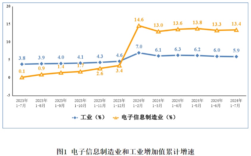 1-7月份,规模以上电子信息制造业增加值同比增长13.4%,增速分别比同期工业、高技术制造业高7.5个和4.5个百分点。7月份,规模以上电子信息制造业增加值同比增长14.3%。