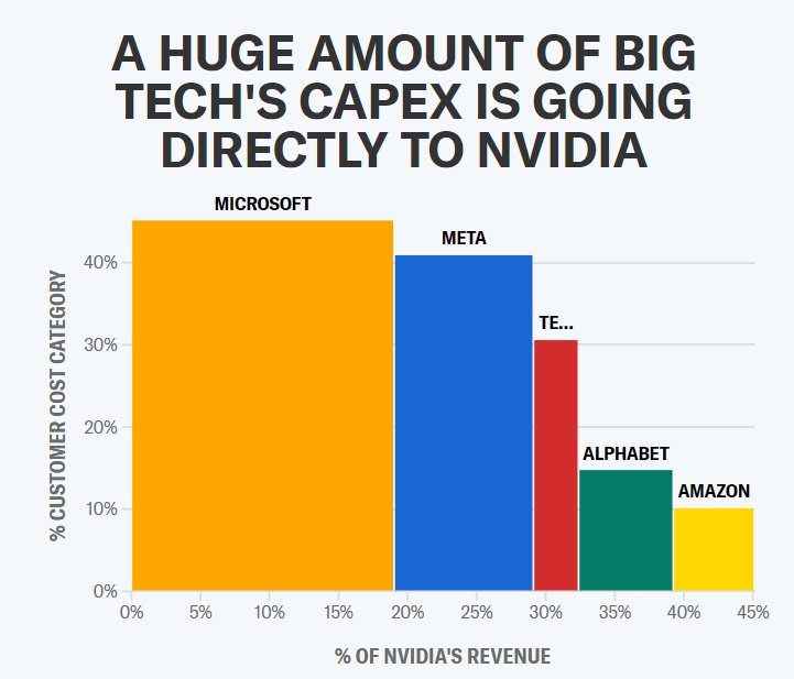 英伟达的未来在一定程度上取决于其他大型科技公司支出规模,以及这些公司的“AI货币化”前景。据机构测算,超大规模的科技巨头微软、Meta、谷歌母公司Alphabet以及亚马逊合力为英伟达贡献超过40%的营收规模。