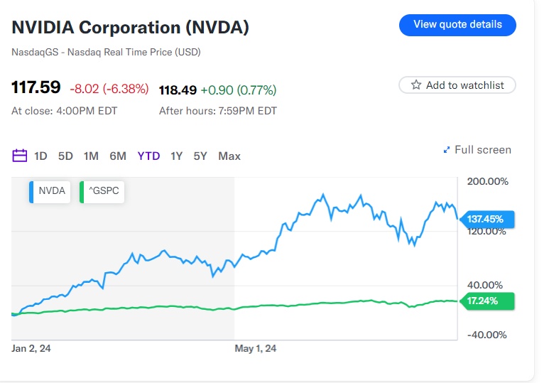 公布财季业绩以及业绩展望后,英伟达股价在周三美股盘后下跌超6%,并截至周四美股收盘大跌超6%。但是年初至今,该股仍上涨了接近140%,领跑整个美股市场。