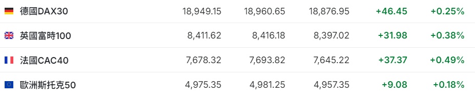 2. 截至发稿,德国DAX指数涨0.25%,英国富时100指数涨0.38%,法国CAC40指数涨0.49%,欧洲斯托克50指数涨0.18%。