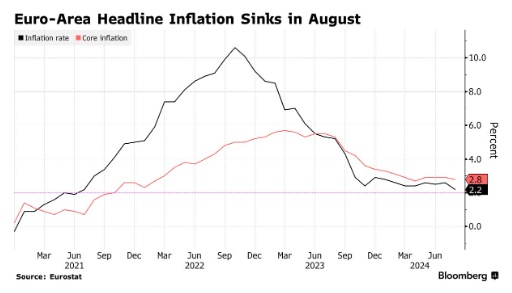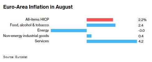 欧盟统计局周五表示,8月消费者价格同比上涨2.2%。这远低于7月的2.6%,与分析师的预期中值相符。剔除了波动较大的食品和能源成本的核心通胀率在连续三个月保持在2.9%后,也如预期降至2.8%。