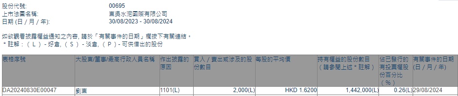 智通财经APP获悉,香港联交所最新资料显示,8月29日,执行董事刘东增持东吴水泥(00695)2000股,平均每股作价1.62港元,总金额为3240港元。增持后最新持股数目为144.2万股,持股比例为0.26%。