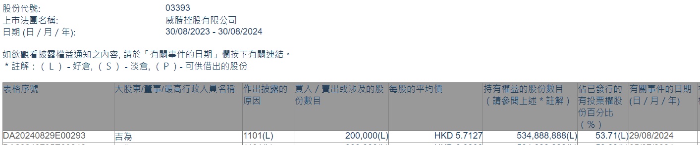 智通财经APP获悉,香港联交所最新资料显示,8月29日,公司执行董事兼主席吉为增持威胜控股(03393)20万股,每股作价为5.7127港元,总金额为114.25万港元。增持后最新持股数目约为5.35亿股,持股比例为53.71%。
