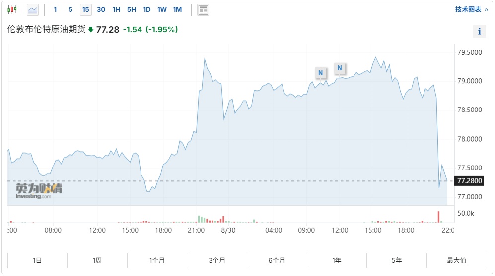 受此消息影响,原油价格出现了短线大幅下跌。WTI原油价格一度大跌3%,目前报价为74.09美元/桶;布伦特原油下跌1.95%,报价为77.28美元/桶。