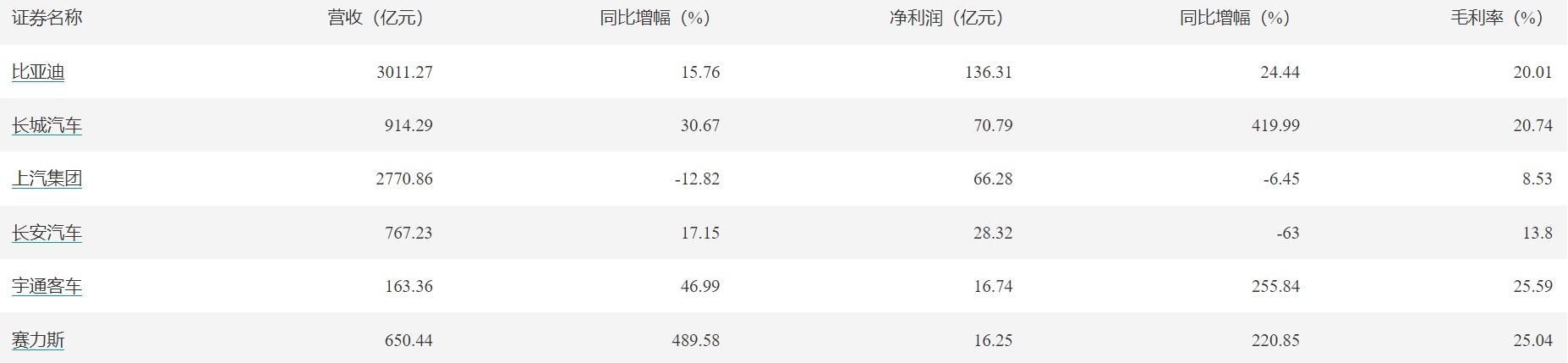 从成分股表现来看,27家盈利,6家亏损。12家公司营收超100亿元,比亚迪、上汽集团、长城汽车营收居前,分别为3011.27亿元、2770.86亿元、914.29亿元。