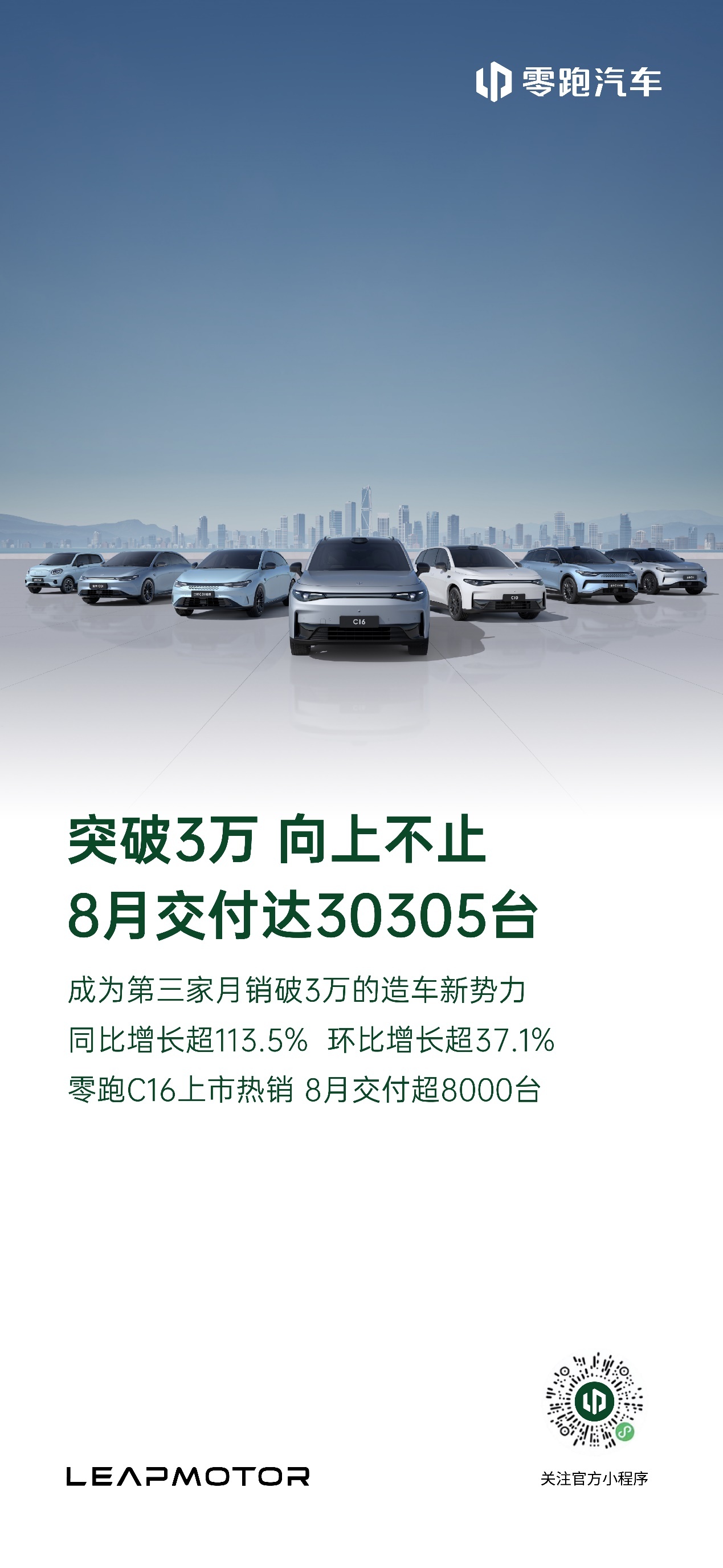 智通财经APP了解到,9月1日,零跑公布8月交付数据,继续6月及7月连续破2万辆后,8月再创新高,交付量达30305辆,同比增长113%,成为第三家(仅次于理想及问界)月销破3万台的造车新势力。此外,该公司6月份上市的高品价比六座SUV C16,在8月交付量超8000辆,在同价位车型中遥遥领先。