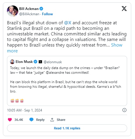 阿克曼在上周六晚间通过X发声,警告称,“X的非法关闭和Starlink账户的冻结,正将巴西推向成为不可投资市场的边缘。”