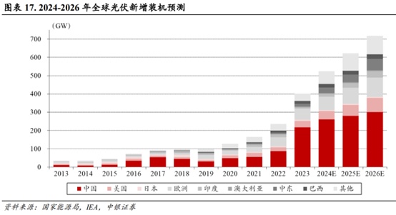 中银证券认为,经济性是支撑光伏装机上量的核心驱动能力,消纳问题虽然阶段性限制光伏装机持续高速增长,但储能发展、电网改造可有效缓解消纳问题。整体而言,海外市场需求高景气度有望持续,预计2024—2026年全球光伏装机需求分别达到 524GW、622GW、717GW,同比增速分别为30.51%、18.78%、15.18%。